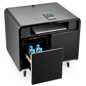 Keeping refreshments close at hand, the nightstand features a dual-drawer system that sets it apart from ordinary side tables. One drawer offers standard storage for books, remotes, or personal items, while the other serves as a whisper-quiet cooler powered by thermoelectric technology. This innovative addition maintains a chilled environment for drinks or snacks, ensuring they’re always within arm’s reach without disturbing the peace of a quiet room.